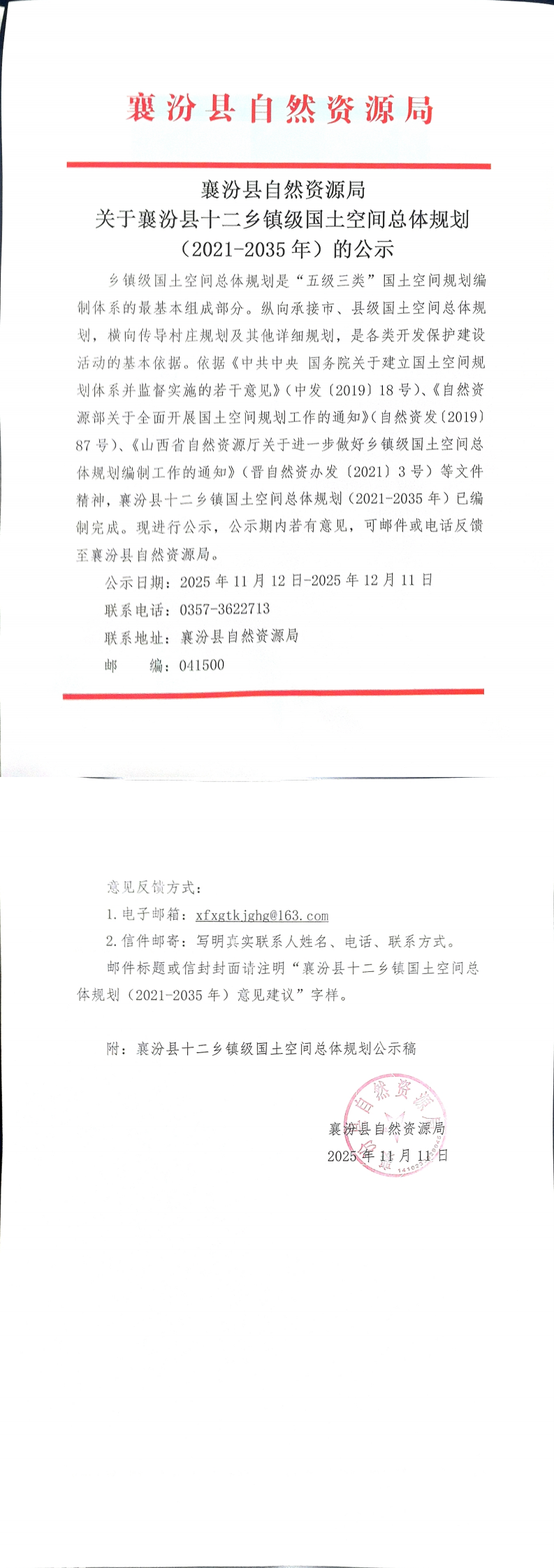 襄汾县自然资源局关于襄汾县十二乡镇级国土空间总体规划(2021-2035年)的公示